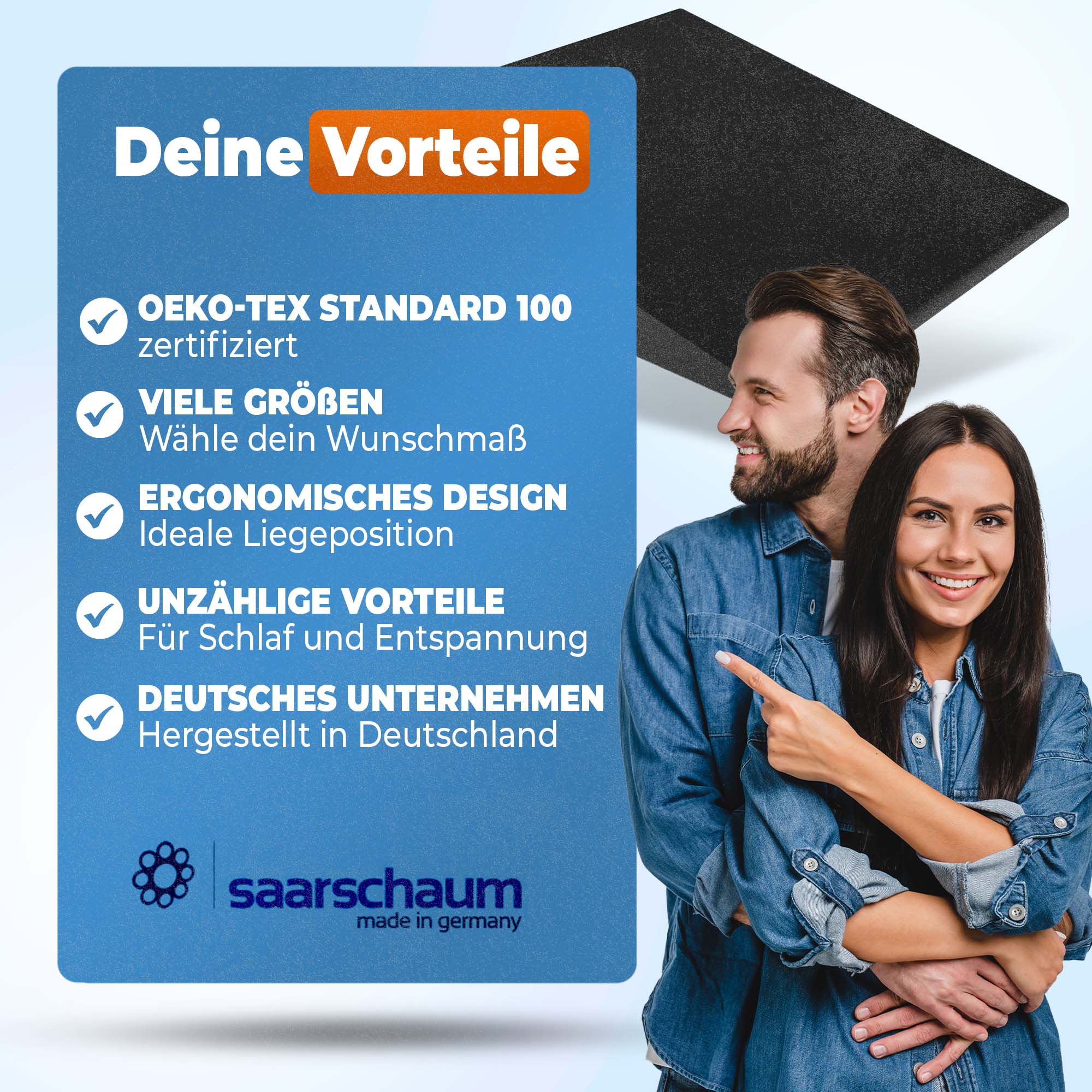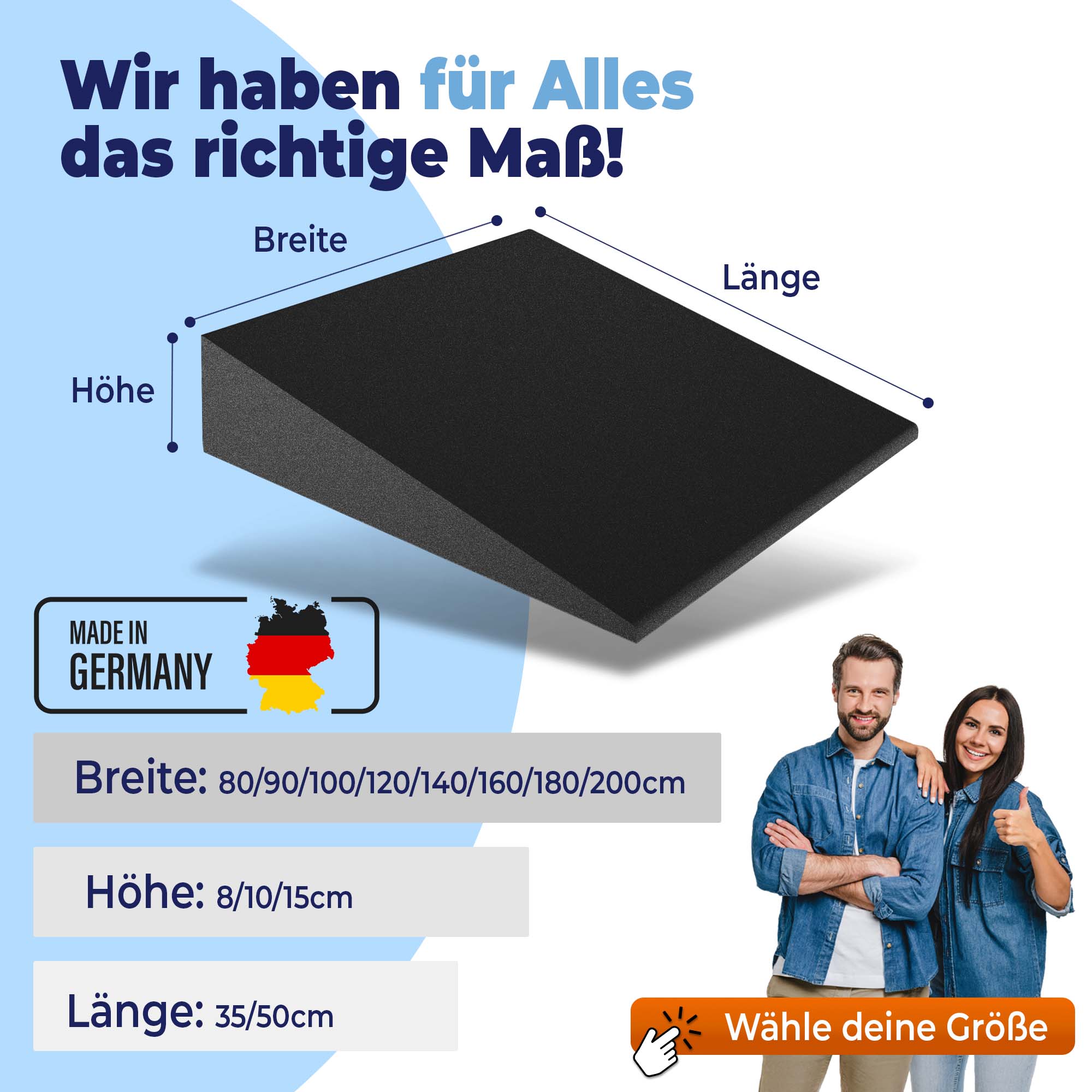 Anti Reflux Schaumstoffkeil für erholsamen Schlaf und gesunden Magen – Anti-Reflux Keil Endlich wieder tief und entspannt schlafen – ohne Reflux, Sodbrennen oder Schnarchen! Unser Anti-Reflux Schaumstoffkeil wird einfach unter das Kopfende Ihrer Matratze gelegt und sorgt für eine sanfte Erhöhung des Oberkörpers. Dadurch wird nicht nur das Risiko von Reflux reduziert, sondern auch ein ruhigerer, erholsamer Schlaf gefördert. Perfekt für alle, die nachts besser durchatmen und morgens erholt aufwachen möchten. Nach OEKO-TEX® STANDARD 100, Produktklasse I zertifiziert – absolut unbedenklich für Babys. Zwei Varianten für Ihre individuellen Bedürfnisse Schwarz – härter: Bietet festen Halt für Personen, die eine stabilere Schlafposition bevorzugen. Weiß – etwas weicher: Angenehm sanft, ideal für leichtere Personen oder alle, die eine sanfte Erhöhung wünschen. Vorteile unseres Anti-Reflux Keils Gesünderer Schlaf: Unterstützt einen tieferen, ruhigeren Schlaf – für mehr Energie und Wohlbefinden am Tag. Bessere Atmung nachts: Die leichte Schräglage fördert die Luftzirkulation und reduziert Atembeschwerden beim Liegen. Weniger Beschwerden: Lindert Reflux, Sodbrennen und Schnarchen – für eine deutlich höhere Lebensqualität. Langfristige Investition: Hochwertiger Schaumstoff für langlebige Unterstützung Nacht für Nacht. Jetzt bestellen – erholsamen Schlaf genießen! Unser Schaumstoffkeil ist die einfache, effektive Lösung für alle, die ihre Schlafqualität verbessern und lästige Beschwerden reduzieren möchten. Zuschnitt nach Maß möglich: Wählen Sie direkt Ihre Wunschgröße im Saarschaum-Zuschnittrechner – frisch für Sie zugeschnitten. Bestellen Sie jetzt und erleben Sie selbst, wie ein Keil aus Schaumstoff ihr Leben verändern kann ! Zuschnitt nach Maß: Einfach Schaumstoff schneiden lassen von Saarschaum!Kaufen Sie Ihren Schaumstoff / Matratze frisch für Sie zugeschnitten im Zuschnittrechner.
