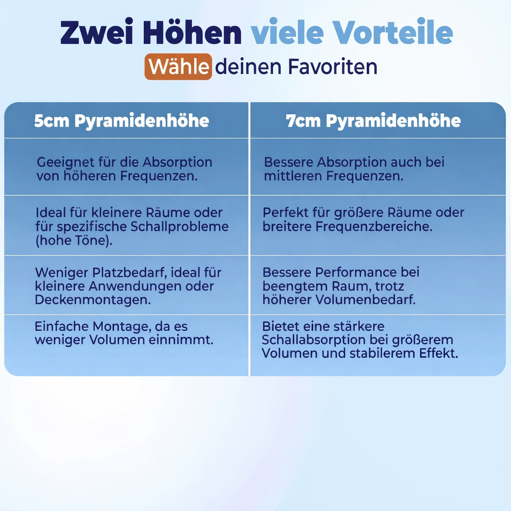 Die pyramidenförmige Oberflächenstruktur vergrößert die wirksame Oberfläche und bricht eintreffende Schallwellen gezielt. Dadurch werden mittlere und hohe Frequenzen effektiv absorbiert, Reflexionen reduziert und eine angenehme, ausgewogene Raumakustik geschaffen.